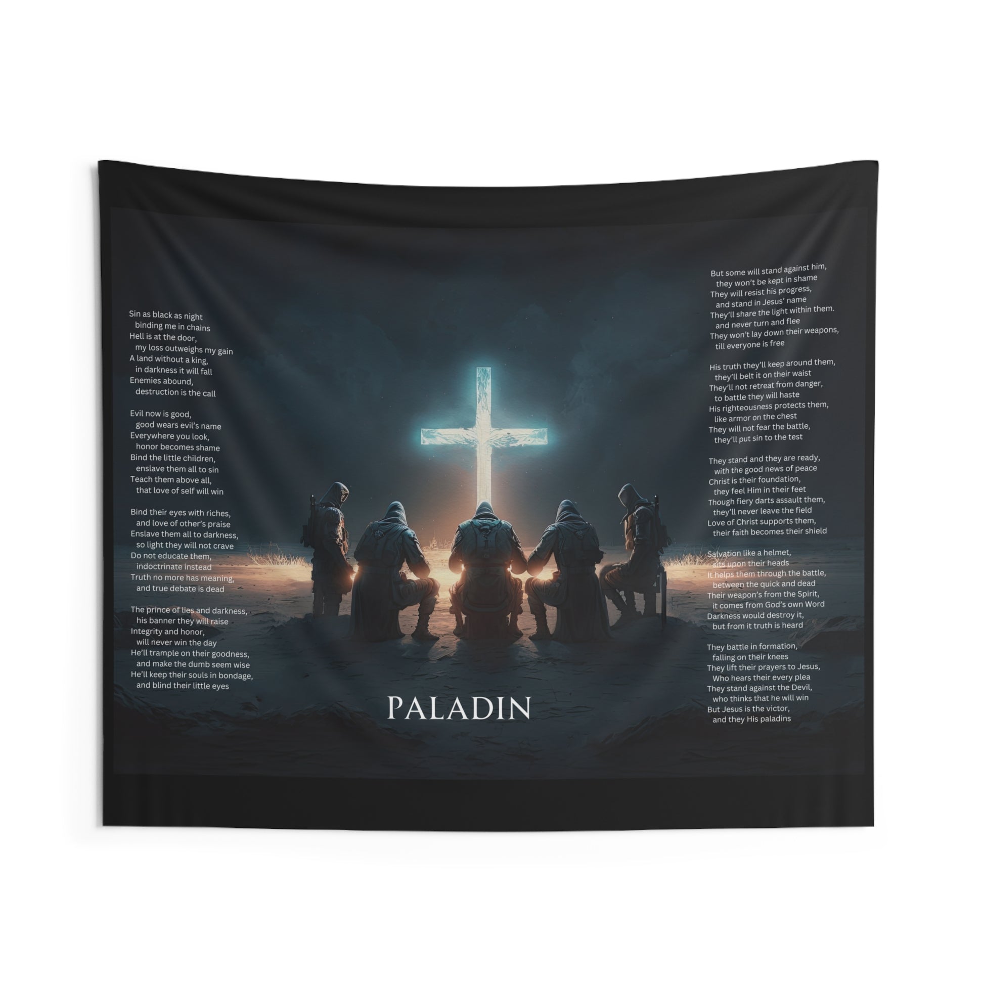 The Paladin Indoor Wall Tapestry is a striking piece designed to elevate your space with both style and meaning. Featuring a powerful and inspirational design, this tapestry acts as a constant reminder to embody strength, courage, and resilience. Its bold imagery encourages you to stand firm and lead with confidence, making it an ideal addition for those seeking motivation in their daily environment. Crafted for indoor display, it seamlessly blends art and purpose to enrich any room.